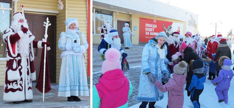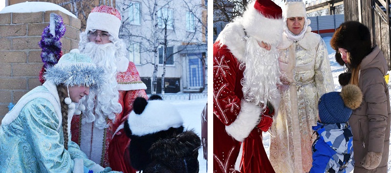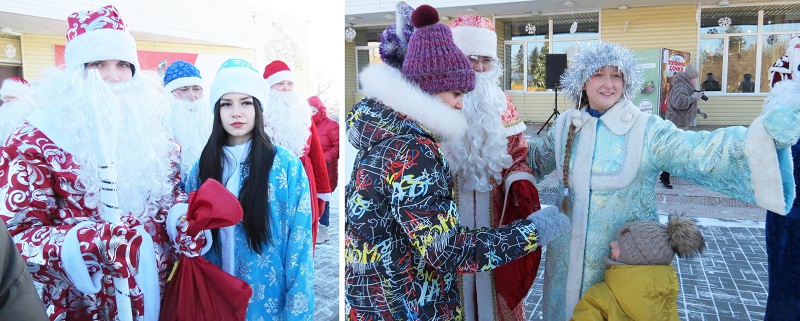 Под веселые новогодние песни «десант» дал старт от кинотеатра «Спутник». Персонажи шли вдоль улиц, радуя прохожих улыбками и поздравлениями.