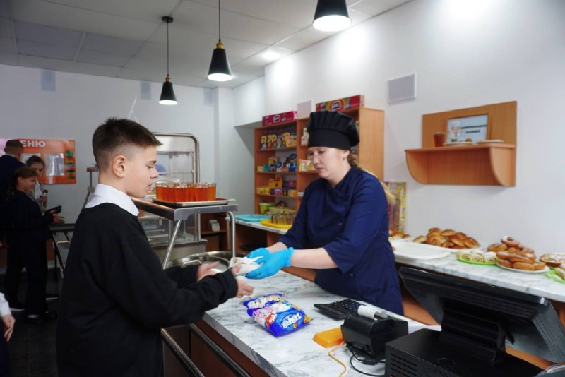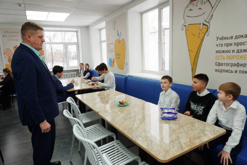 Школьное кафе полностью обновлено — от пола до потолка. Здесь создали современное пространство с ярким дизайном и удобной мебелью. На стенах появились красочные рисунки, а на выходе установлена магнитная доска, где ученики могут делиться своими настроениями и отзывами о питании. На доске только положительные смайлики. О посещении кафе школы № 2 рассказал мэр города Дмитрий Лебедев на своей странице в телеграмм.