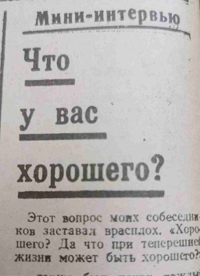 «Этот вопрос моих собеседников заставал врасплох. Хорошего? Да что при теперешней жизни может быть хорошего? Таким был каждый ответ, и все же в дальнейшей беседе мы находили, от чего можно порадоваться, чем согреть душу, чему можно улыбнуться.