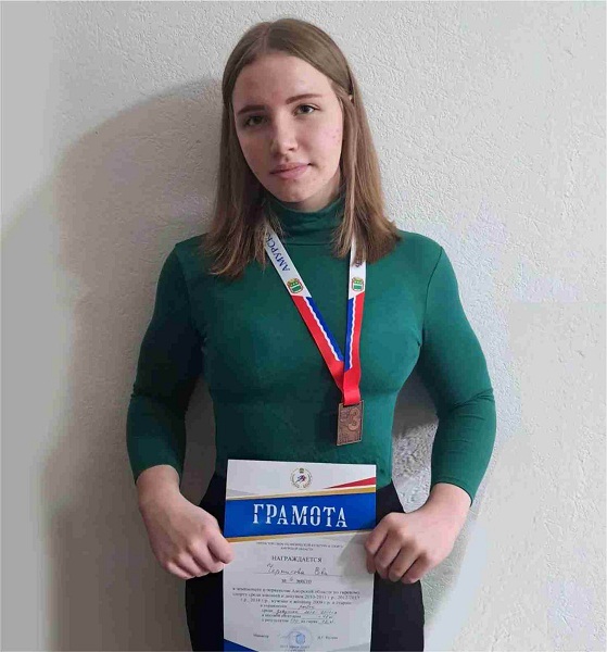 Черникова Ева (на фото) заняла 3 место в упражнении рывок, среди девушек 2012-2013 г.р. в весовой категории +48 кг, с результатом 130 на гирях 12 кг (тренер-преподаватель Тимшин Г.Б.).
