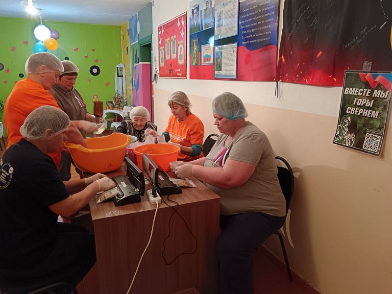 Дина Иннокентьевна режет ленты для масксетей и плетёт сети, чистит овощи для сушки на сублимированные супы, готовит пакетики и фасует супы для бойцов СВО.