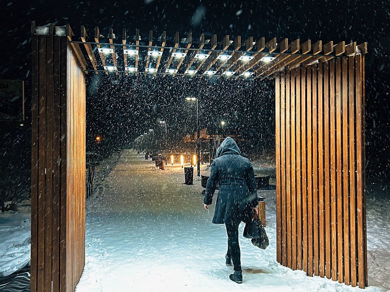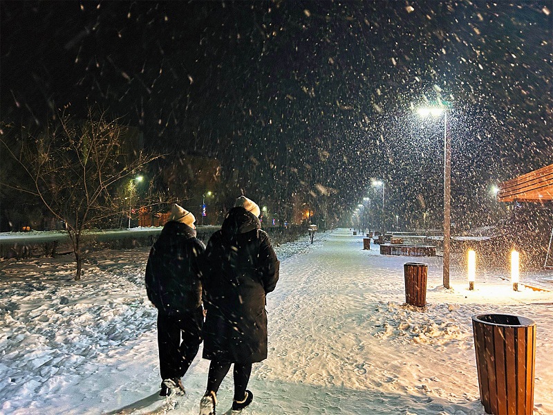 В этот же день вечером желание девчонок сбылось - пошел снег! На фото - обновленный сквер в дневное и вечернее время!